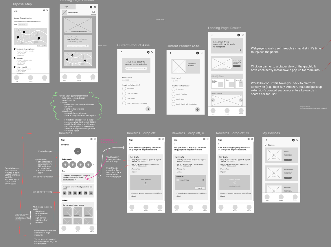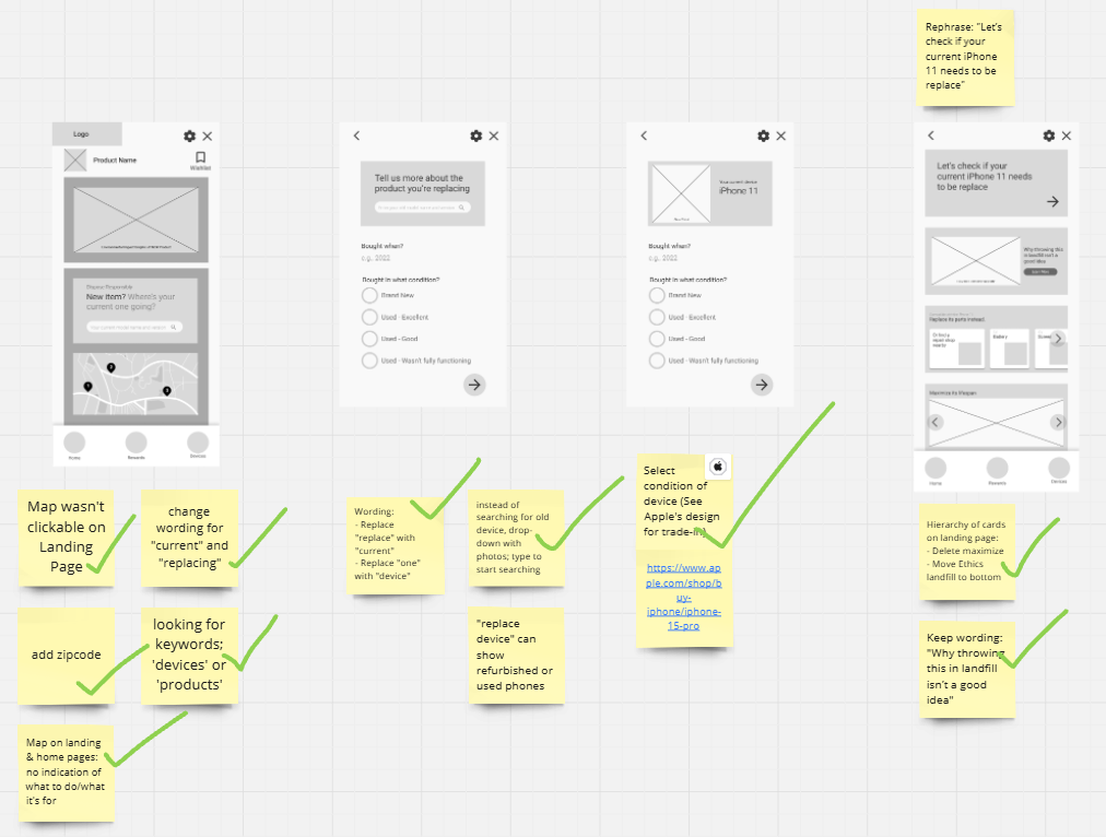 Usability testing uncovered key points of improvement, looking specifically at tasks where users struggled to complete the task. We parsed through our notes and transcripts and with sticky notes added a specific recommendation or feedback to each frame in the prototype.