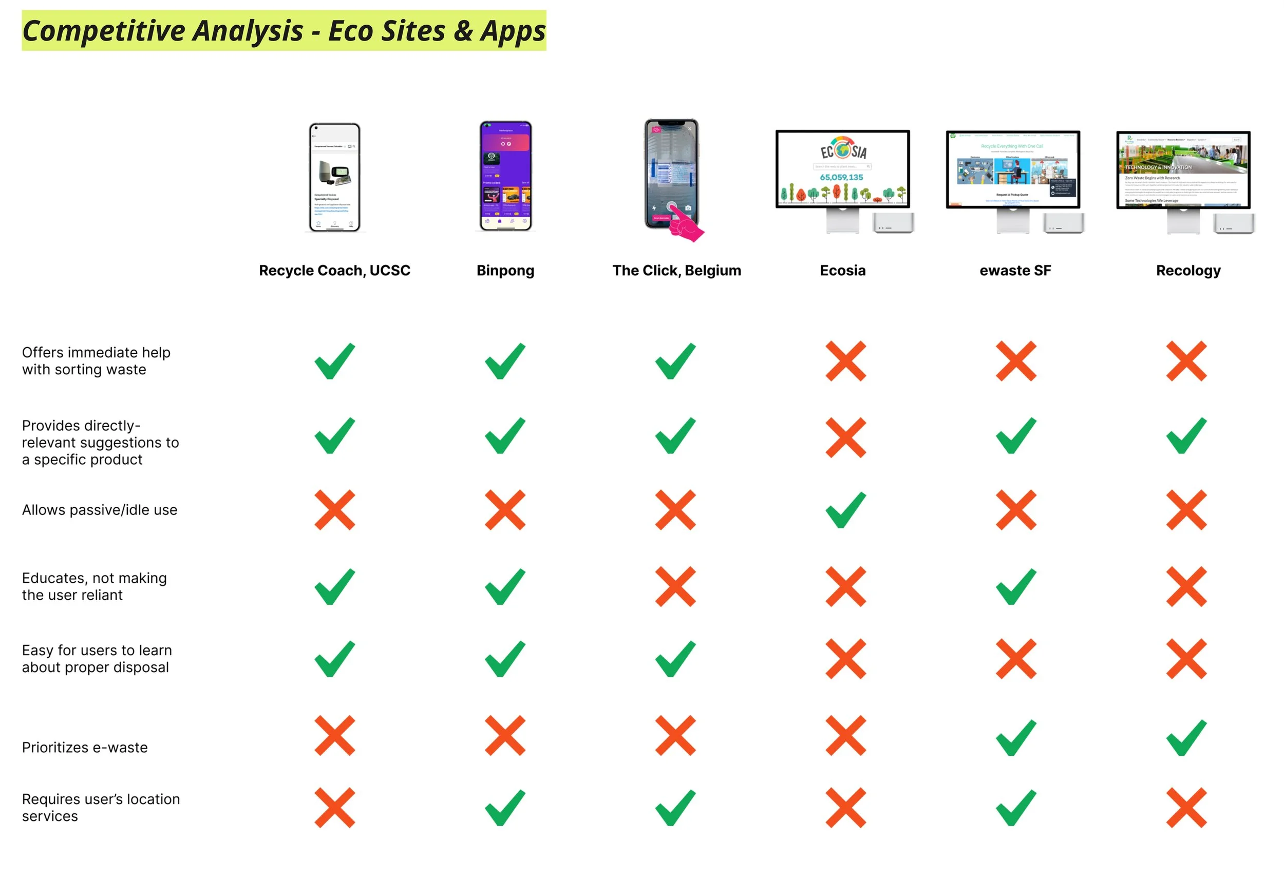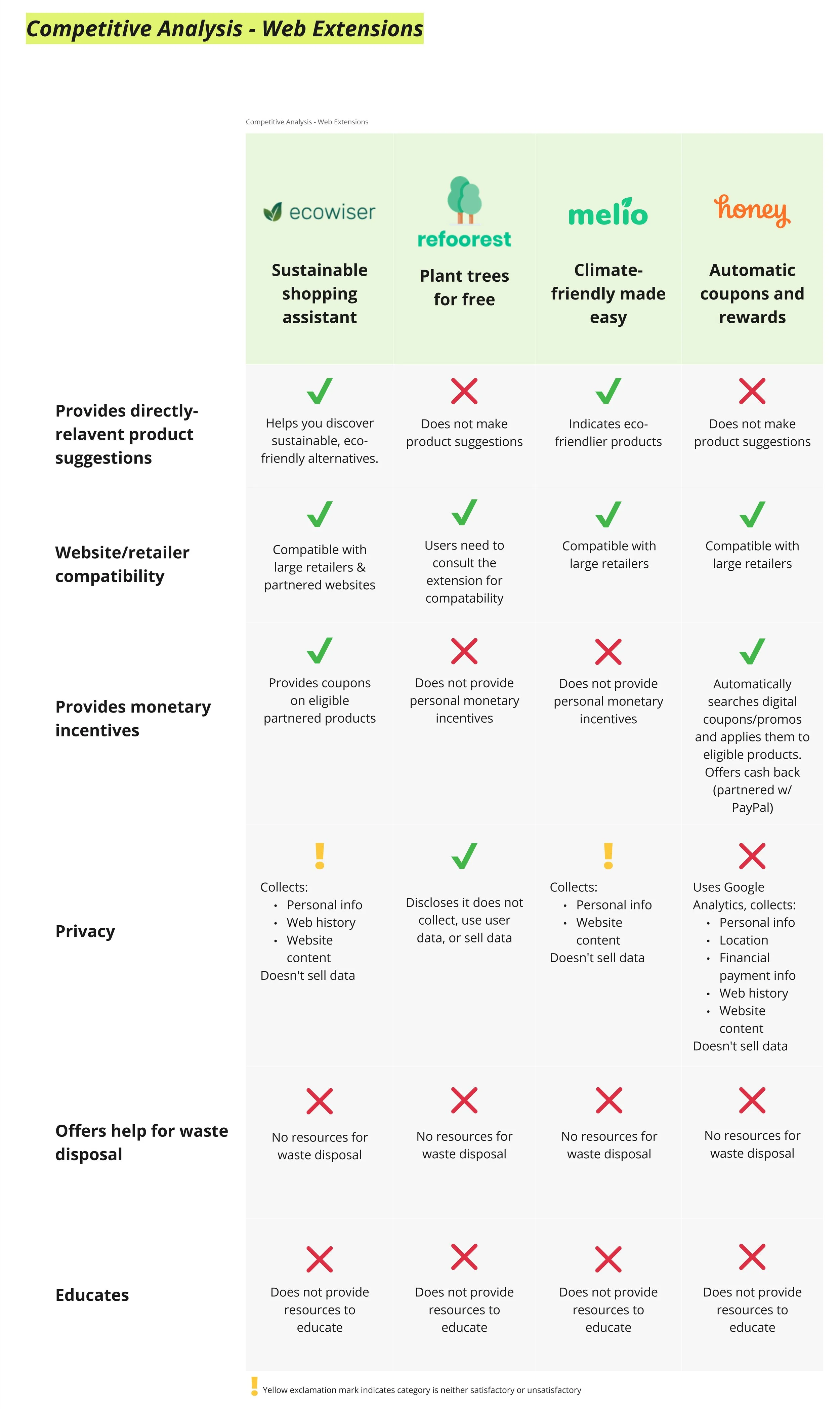 We completed a competitive analysis on platforms with similar concepts, such as websites, mobile applications, and adjacent web browser extensions. With our HMW statements and previous research, we created a grid with categories for what these platforms excelled at and what features were absent from each other. These helped us find gaps and opportunities for our own extension.